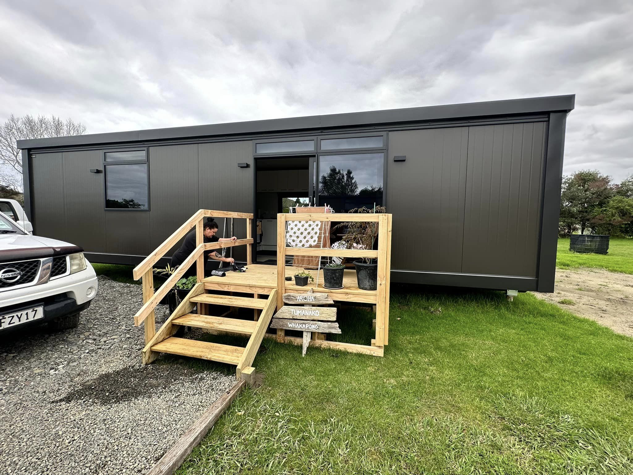 Janina Kopua and her Ūawa Whānau Ora kaimahi Jamie Kernohan inside her cosy new pod after her house became red stickered following Cyclone Hale in January. Pod homes are small prefabricated houses, which come as compact units that are completely self contained with electricity, water, hygiene services and some like Janina's have solar panels. Prior to moving in here one month ago Janina was homeless, but soon she will be part of a pod community as more of these whare arrive housing displaced whānau on this piece of donated land which will be officially opened and blessed in July 2023.