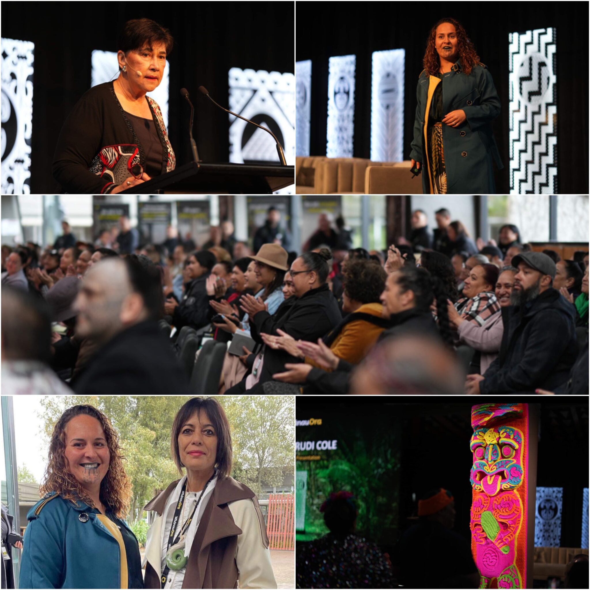 Lissy & Rudi Cole were welcomed onto the stage to present their incredible Crotchet Pou Te Wharau. Their korero and love for their mahi resonated with the crowded room as we all reminisced about when we had crotchet in our lives with our Nans or our Aunties. Rudi took us through the meaning of the pou and explained the delicate and intricate artwork completely made of wool and by hand. Originally commissioned by Whānau Ora after viewing their work at an exhibition in Auckland, it was a careful process that took two years thanks to their craftmanship and COVID.