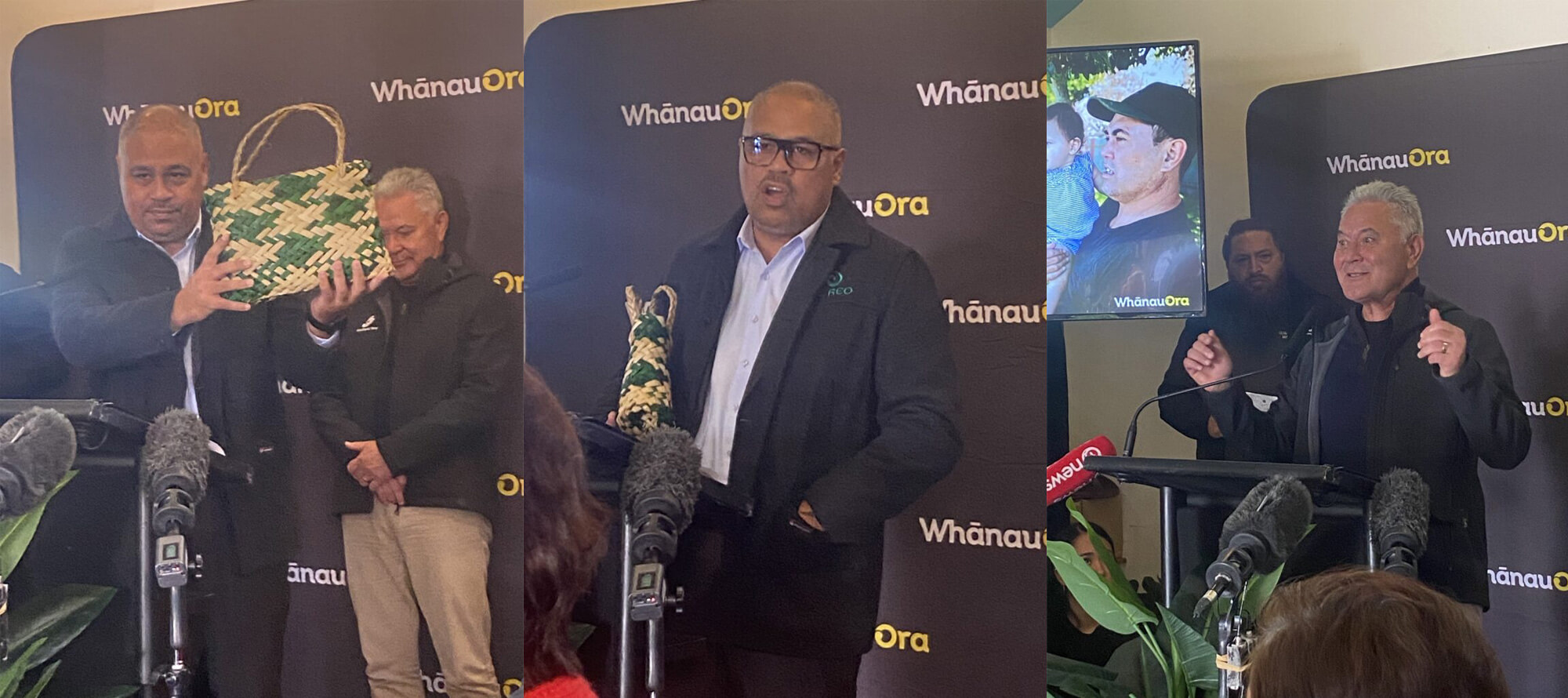 Minister Henare accepted a taonga from Whānau Ora Commissioning Agency Chair, Merepeka Raukawa-Tait before expressing the impact the Ngā Tini Whetū pilot has had.